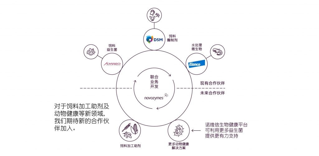 诺维信目前在农牧领域的合作伙伴主要包括帝斯曼(饲料酶制剂)、礼蓝(水质改良剂)、安迪苏(饲料益生菌)等,涉及产业包括饲料添加剂、预混料与动保企业。