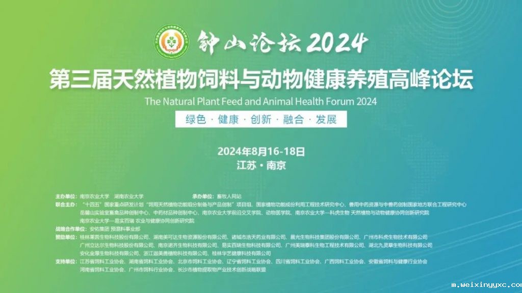 由南京农业大学动物科技学院和湖南农业大学动物科技学院联合主办的“钟山论坛2024·第三届天然植物饲料与动物健康养殖高峰论坛”,将于2024年8月16日至18日在南京白金汉爵大酒店盛大举行。